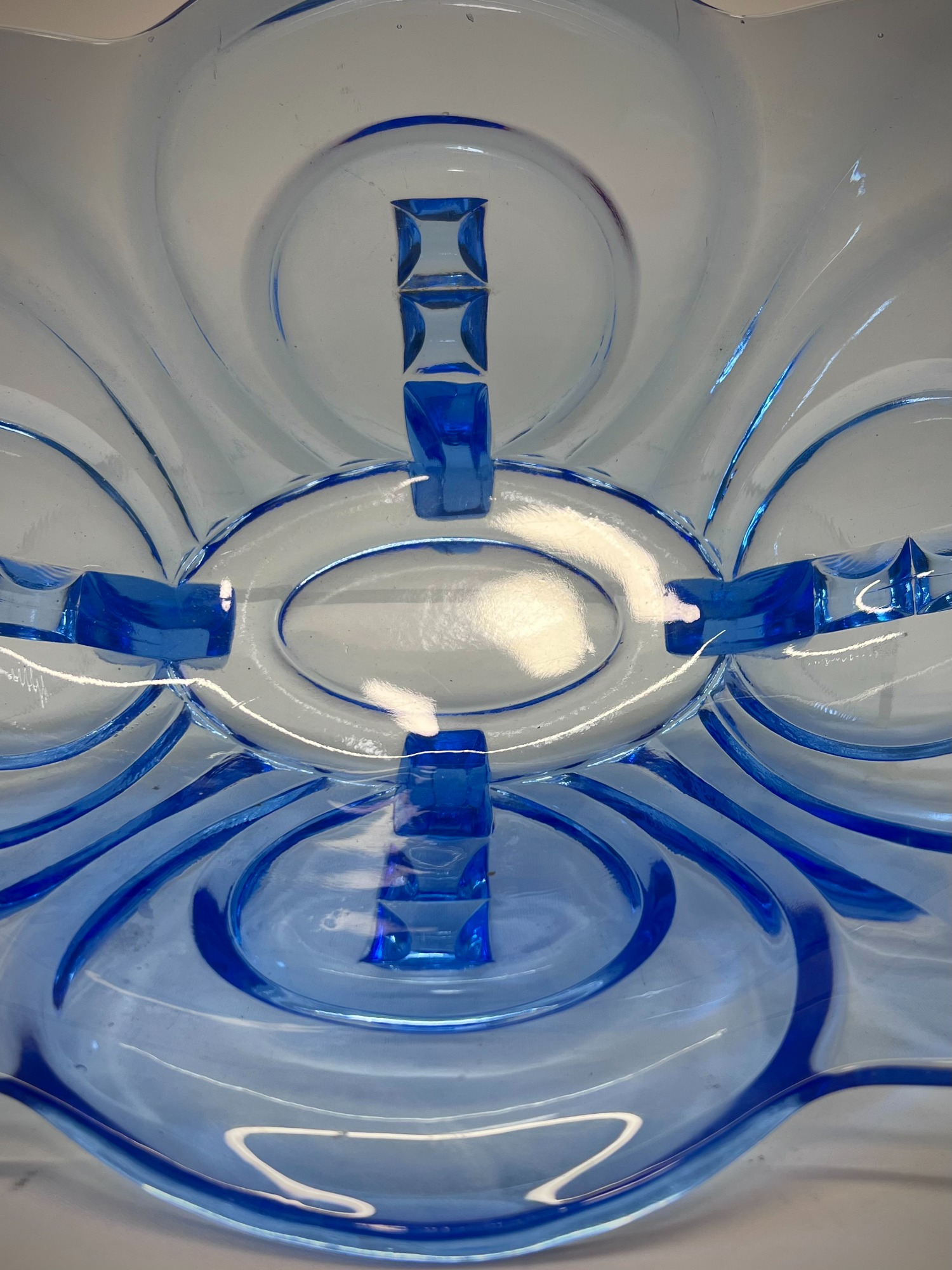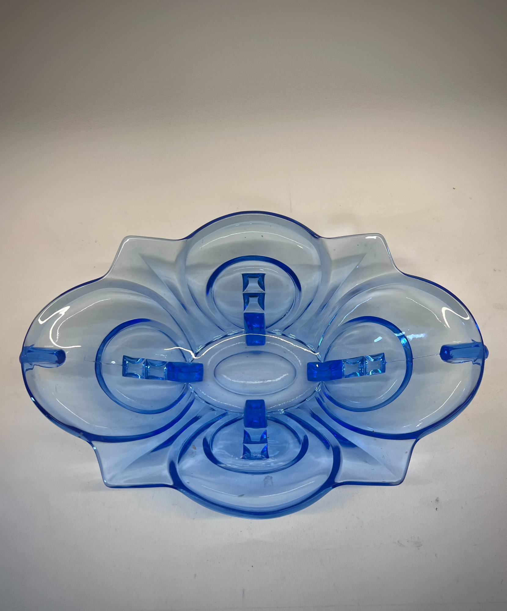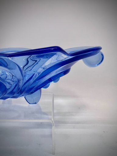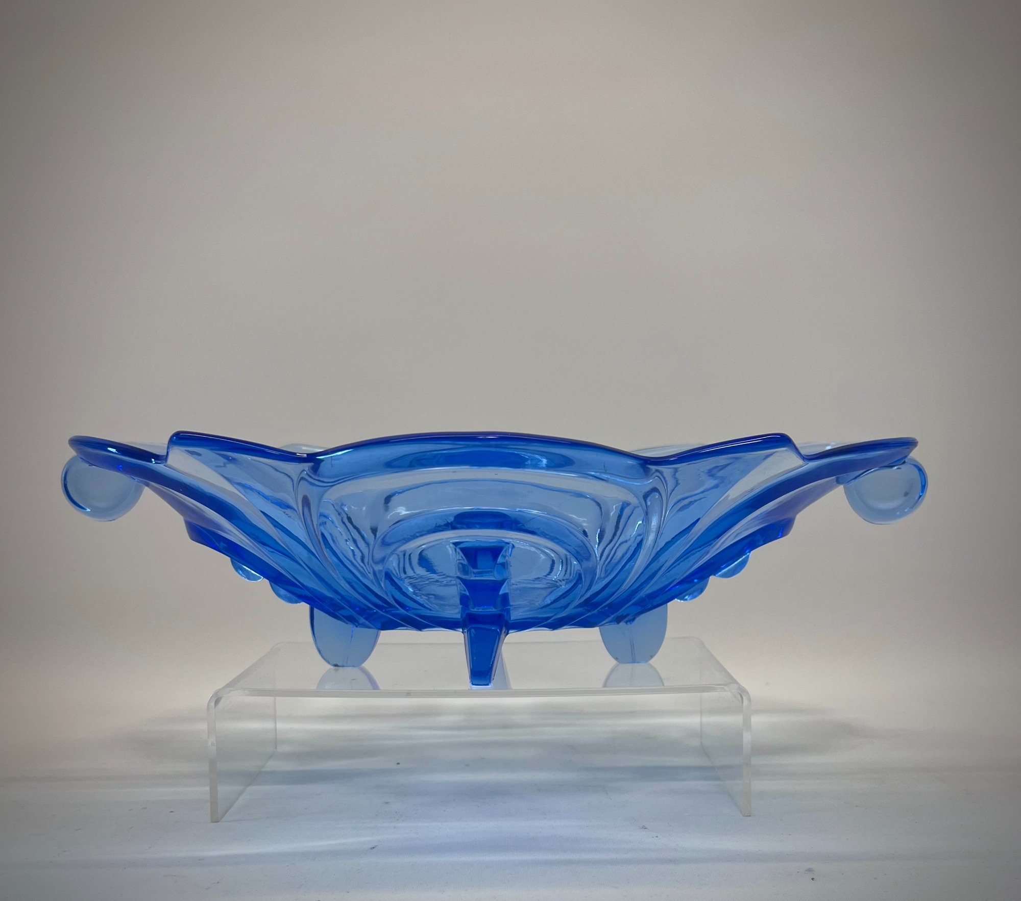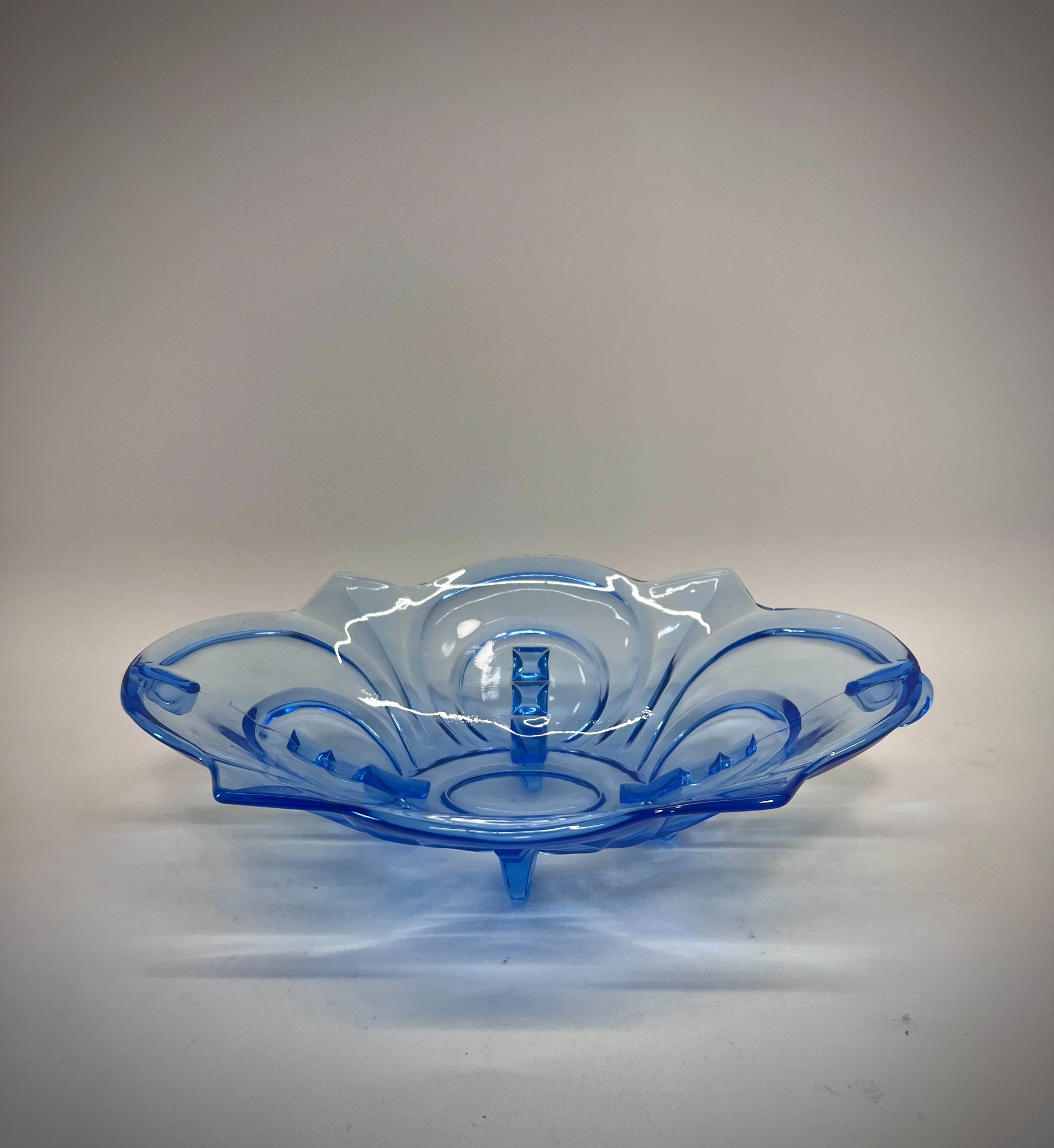 A sculptural pressed‑glass bowl in deep blue, defined by the geometry and symmetry that shaped Central European Art Deco design. The form is bold: radiating stepped lines, fin‑like protrusions, and a wide, elongated footprint that gives the piece presence without heaviness. The glass catches light in a way that emphasises both the clarity of the material and the precision of the mould.