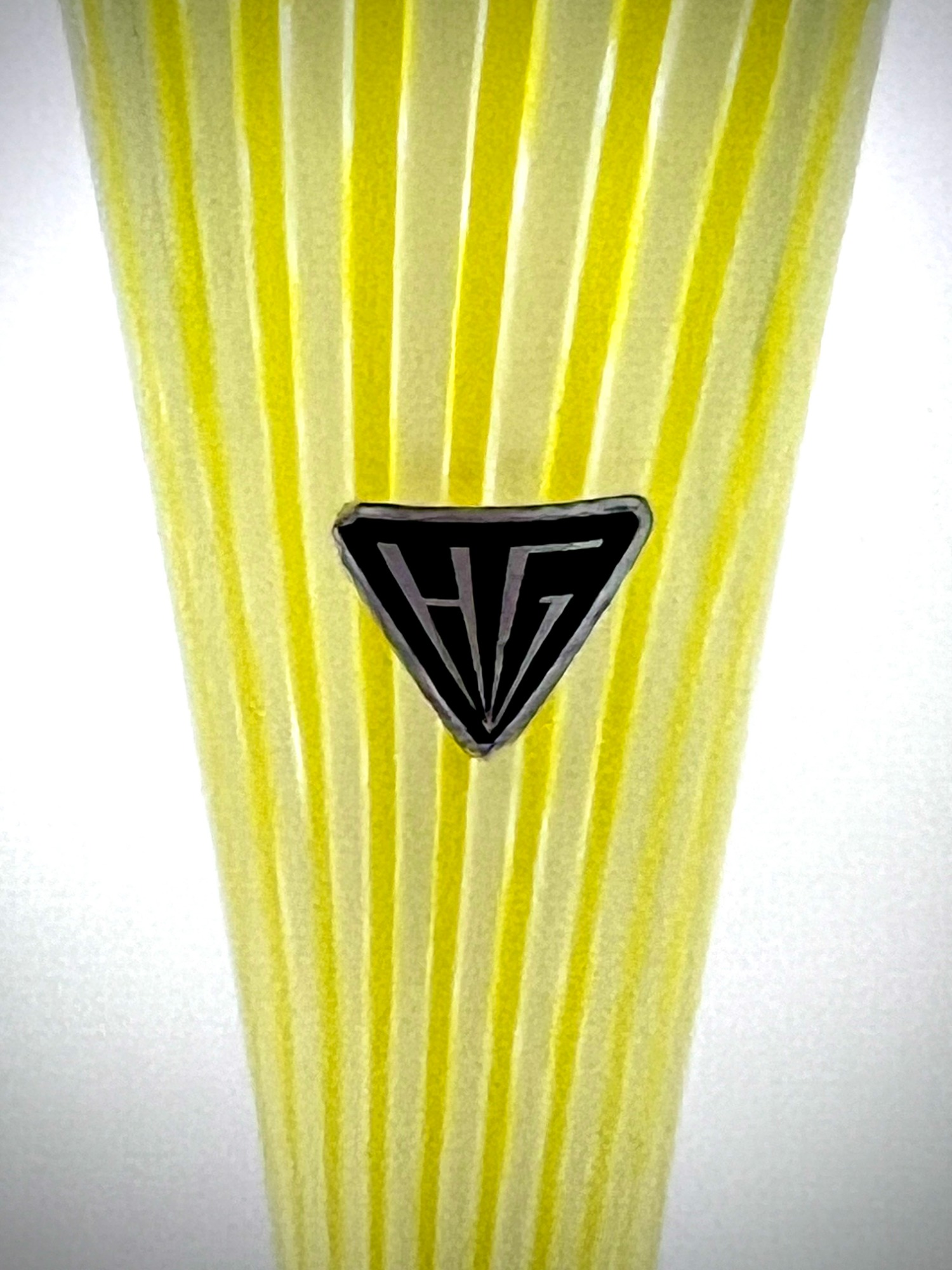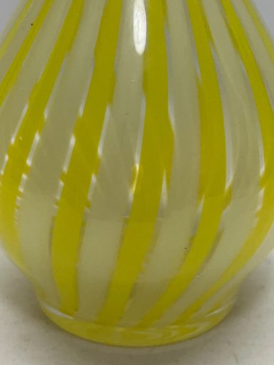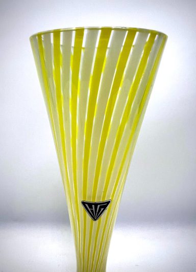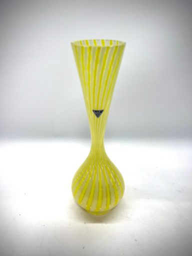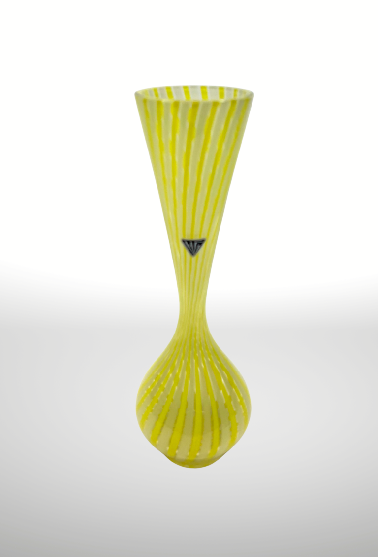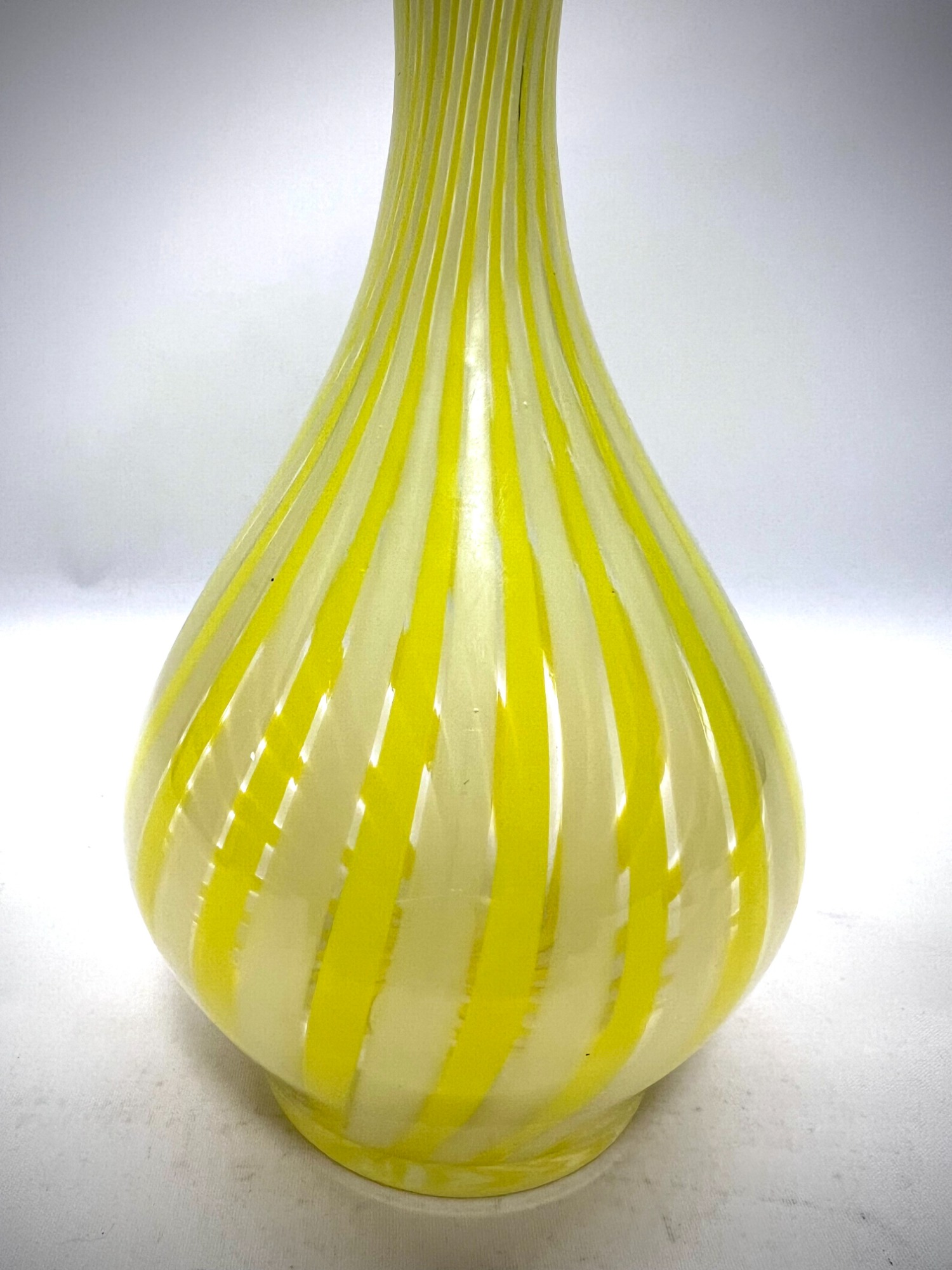 This tall vase from the 1954–1962 production period shows exactly that: a slender, hourglass‑like silhouette, vertical white linework, and a saturated yellow tone that feels both architectural and warm.
