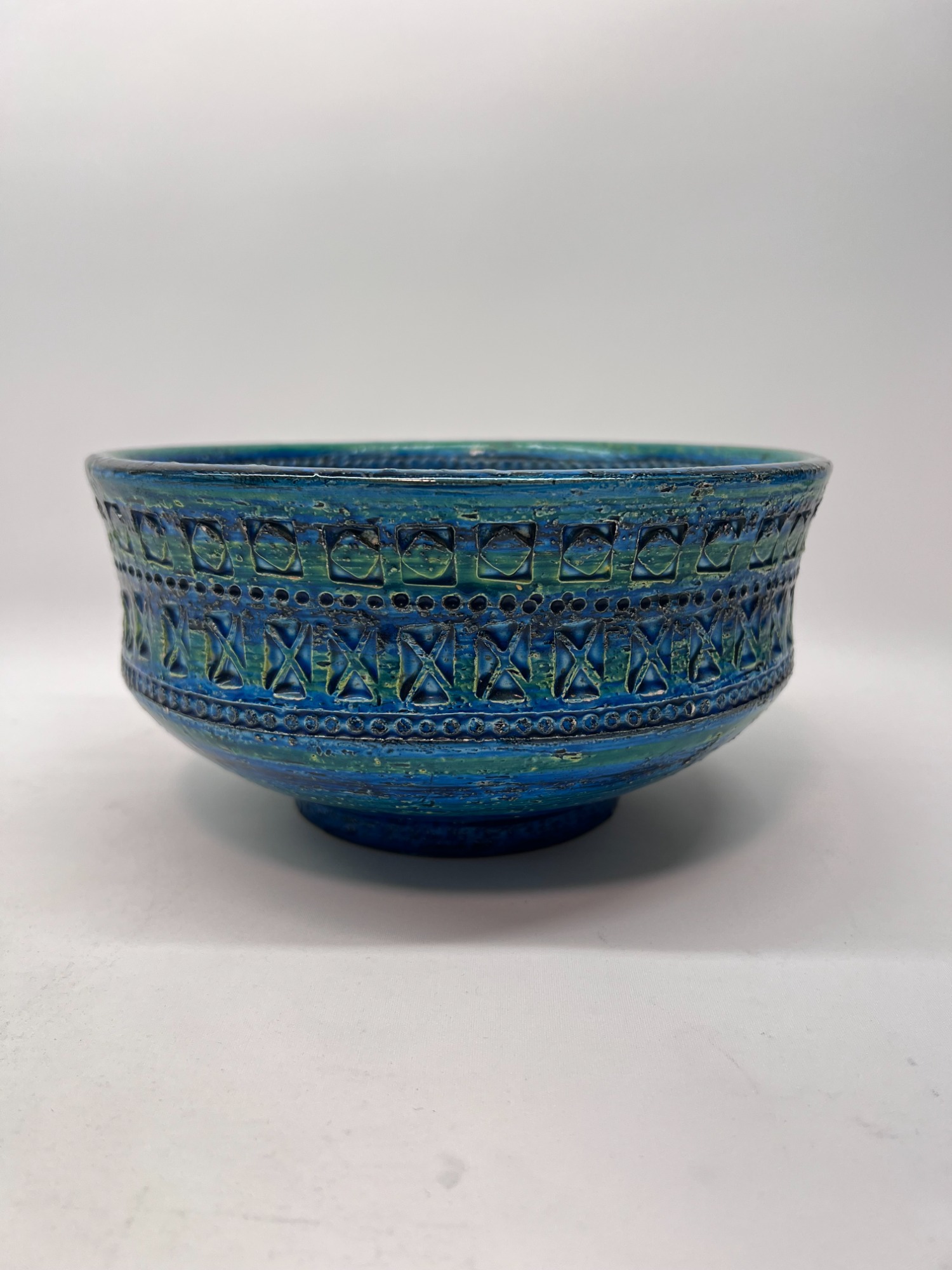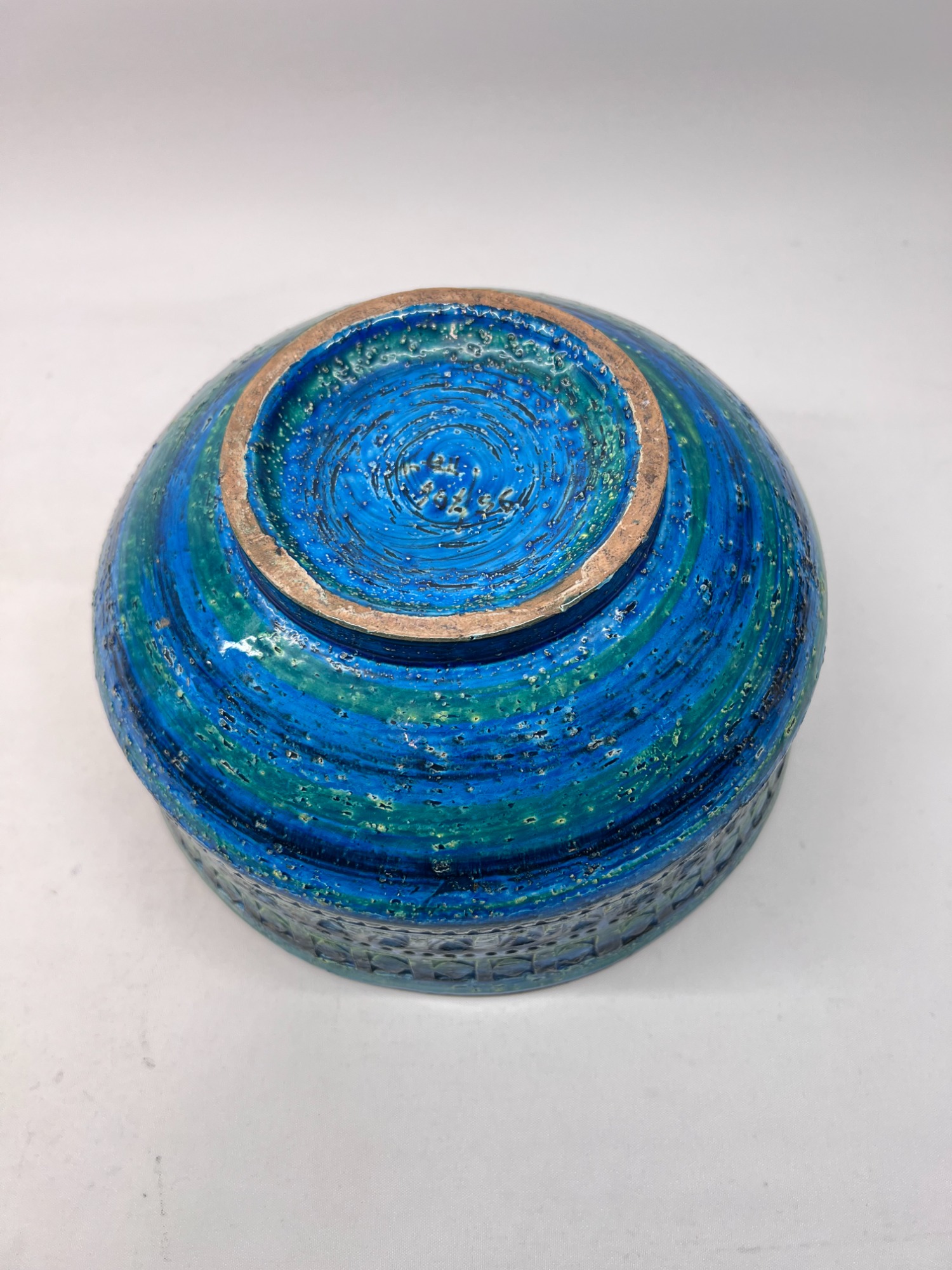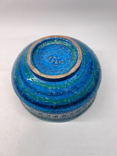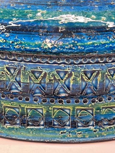 The Rimini Blue series is one of Bitossi’s most recognisable signatures — a dialogue of carved texture, saturated turquoise glaze and rhythmic patterning. This bowl captures that vocabulary with clarity: geometric reliefs, hand‑incised motifs and the deep, luminous blue that made Aldo Londi’s work iconic.