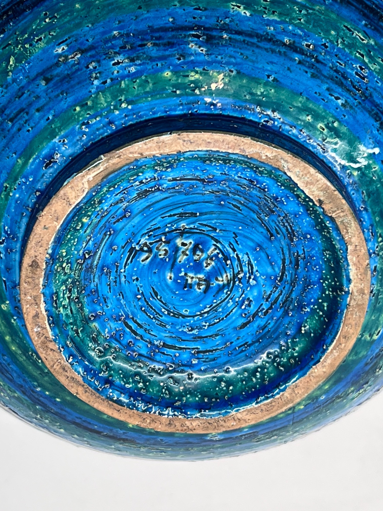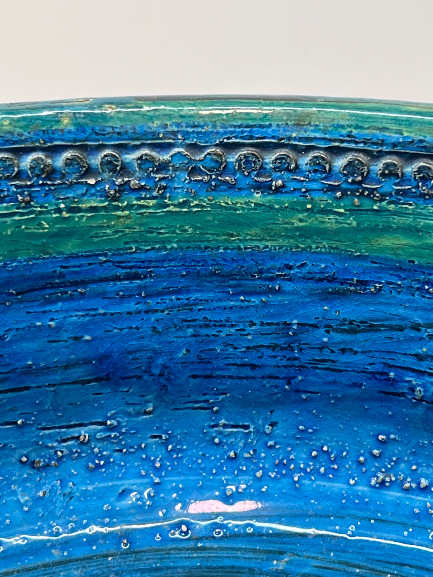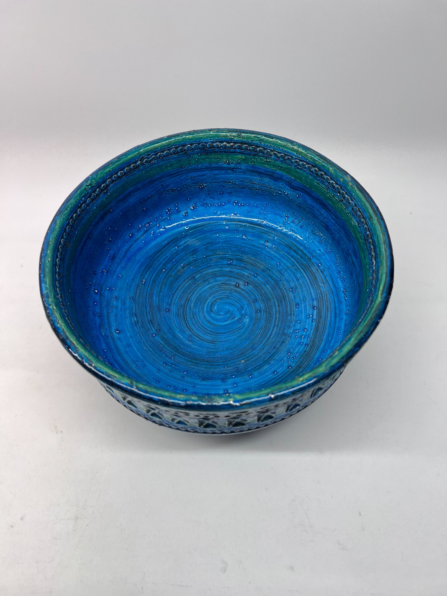 The Rimini Blue series is one of Bitossi’s most recognisable signatures — a dialogue of carved texture, saturated turquoise glaze and rhythmic patterning. This bowl captures that vocabulary with clarity: geometric reliefs, hand‑incised motifs and the deep, luminous blue that made Aldo Londi’s work iconic.