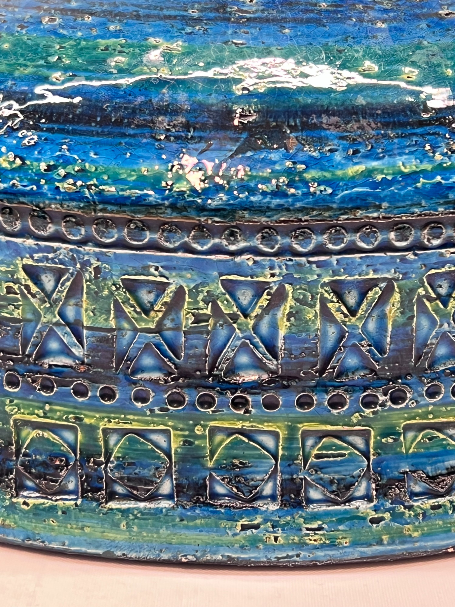The glaze pools in the recesses, shifting from turquoise to cobalt, while the raised pattern catches the light. A piece that reads both as sculpture and as functional ceramic — unmistakably Italian, unmistakably Bitossi.