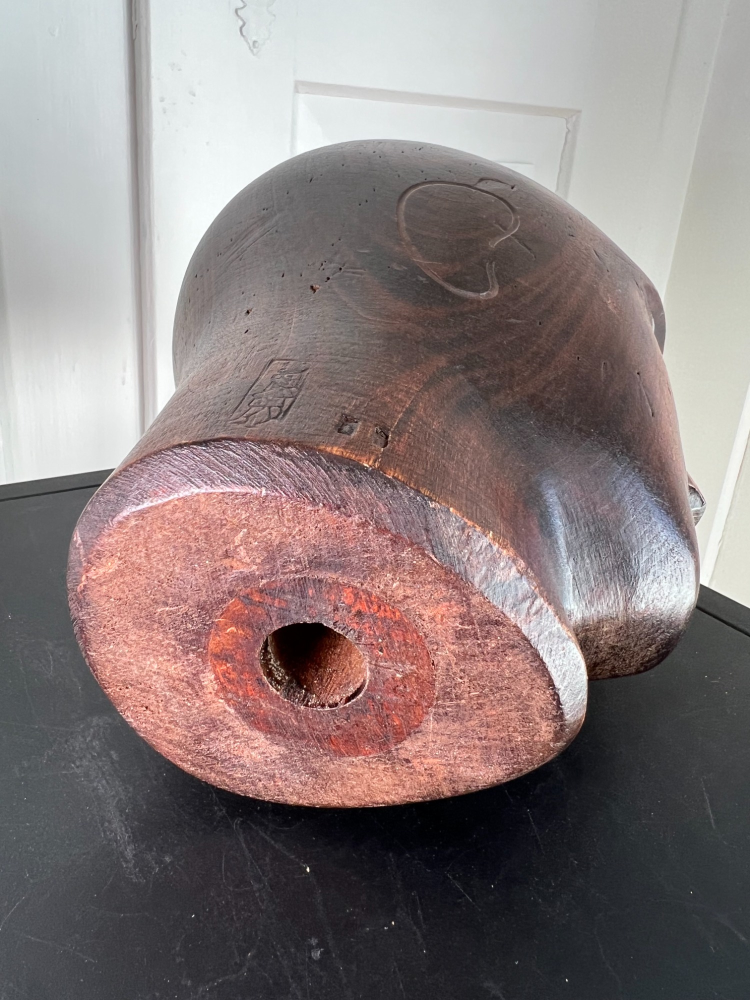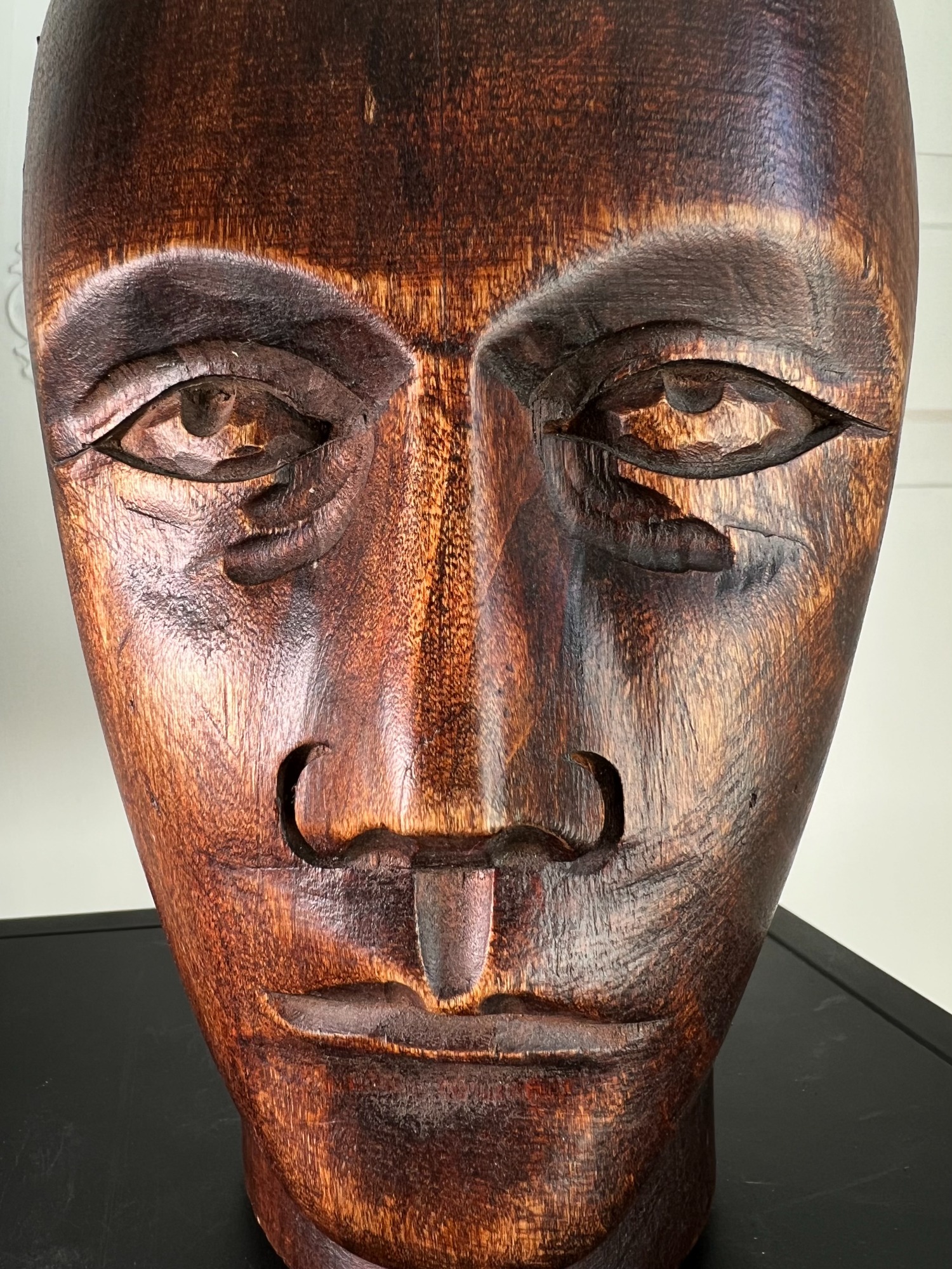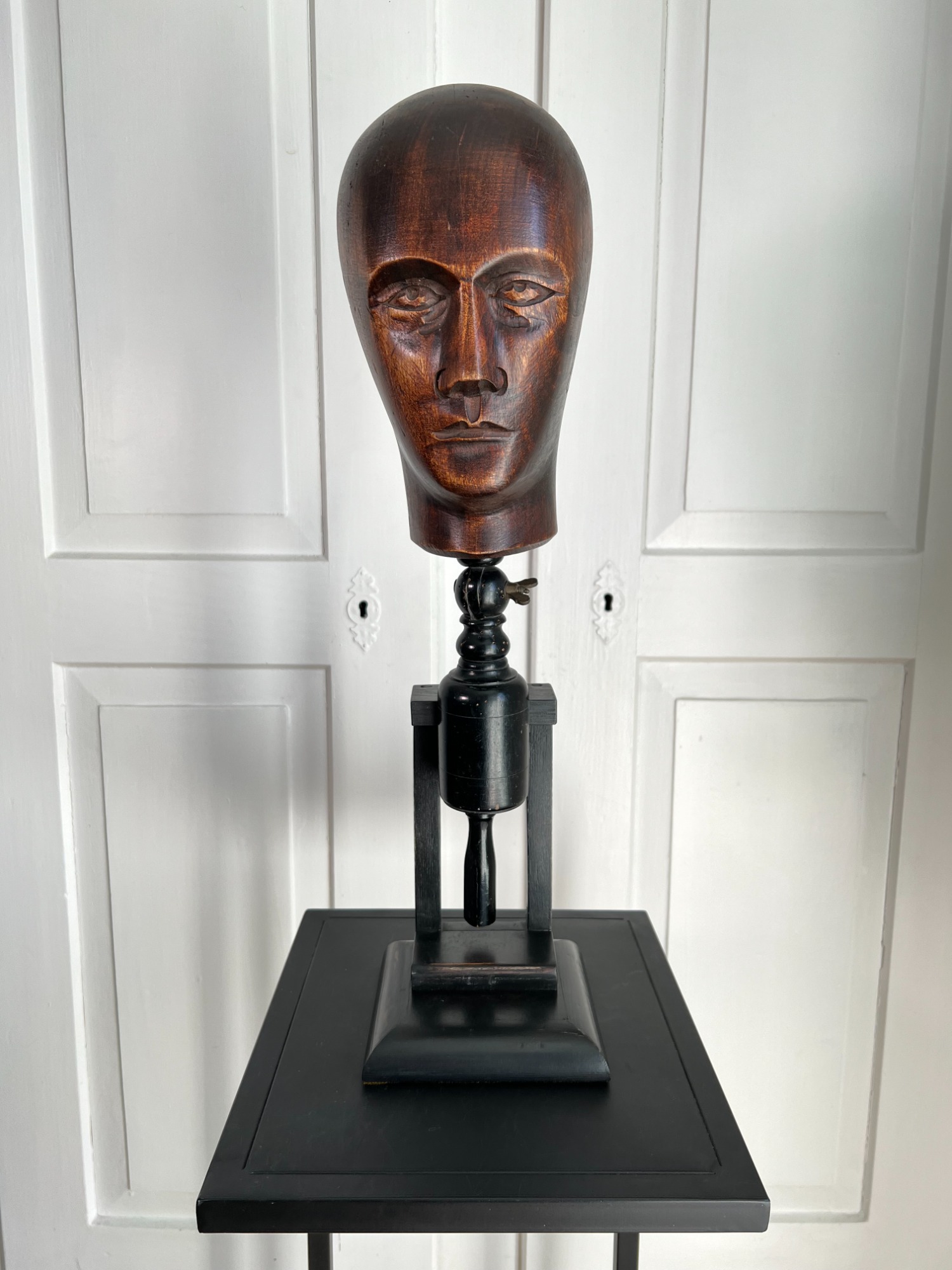 Materials: Carved wood headform; ebonised turned wood stand with round base