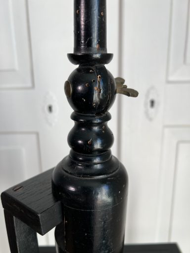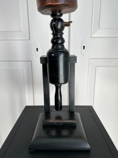 A sculptural relic from the world of early 20th-century fashion, this antique milliner’s headform was likely used in a French atelier or boutique around 1900 for displaying hats, wigs, or veils. The carved wood head is mounted on an elegantly turned ebonised wooden stand