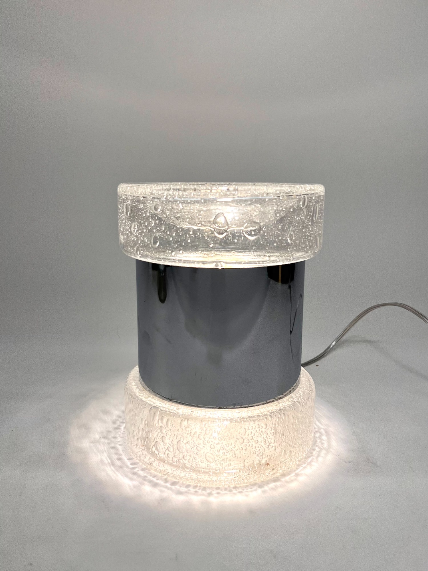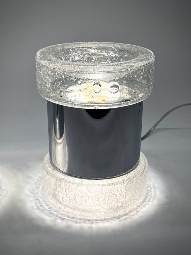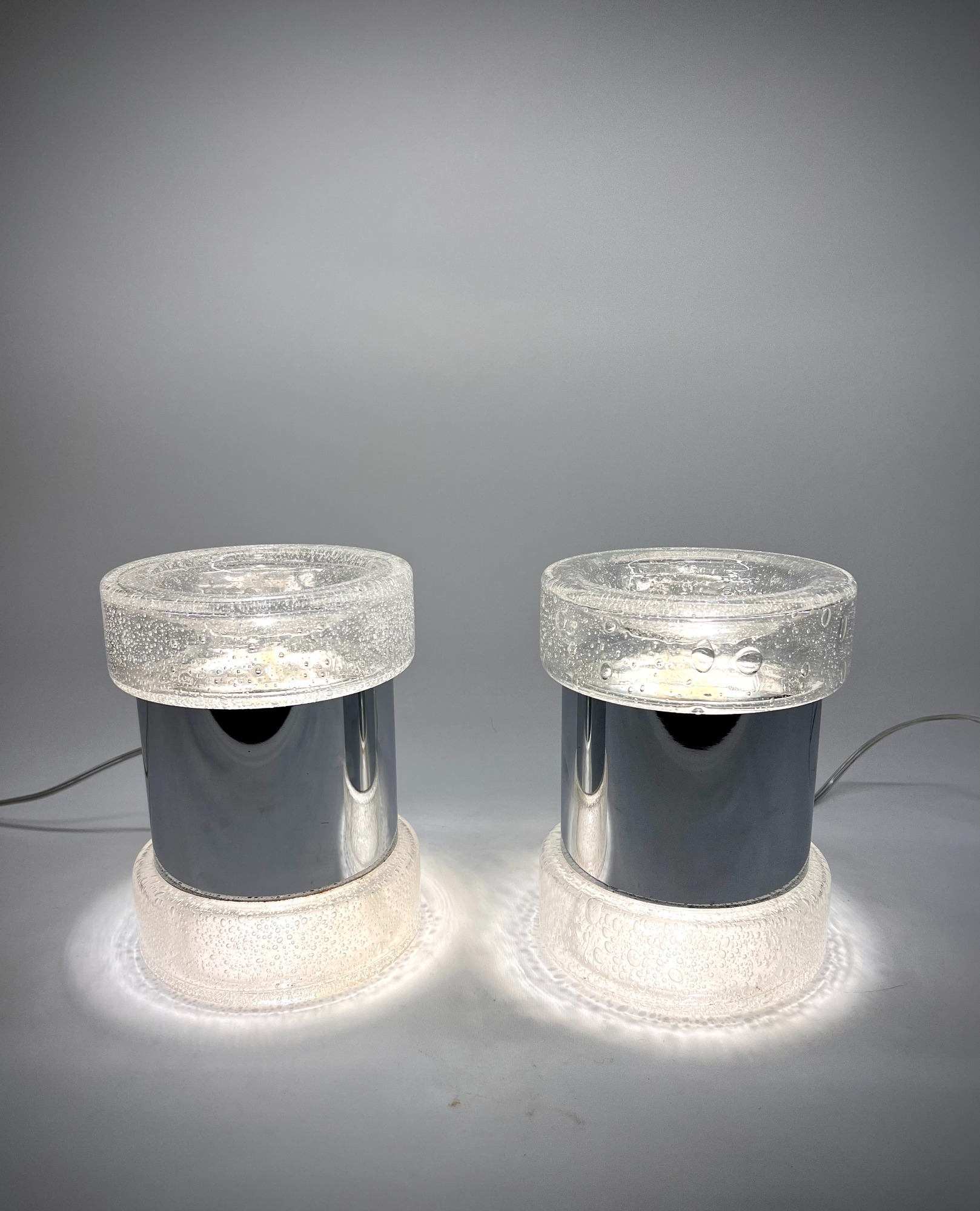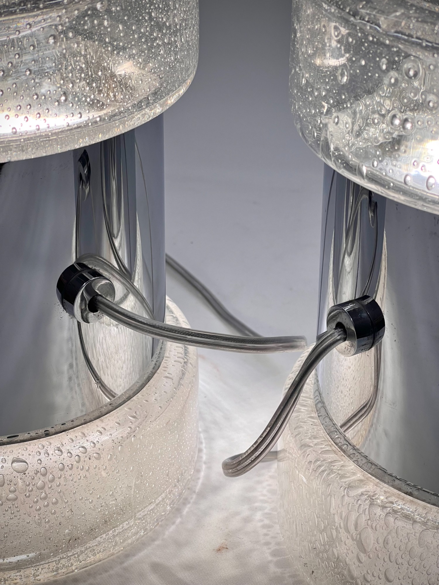 Each lamp features a cylindrical chrome body flanked by textured glass sections embedded with small, controlled air bubbles (vetro con bollicine), creating a soft, glowing halo when lit. The craftsmanship and proportions reflect the refined sensibility of mid-century Italian design.