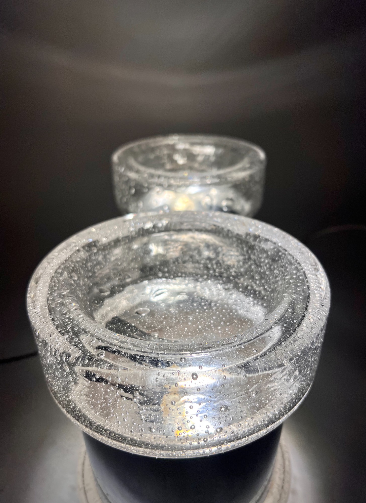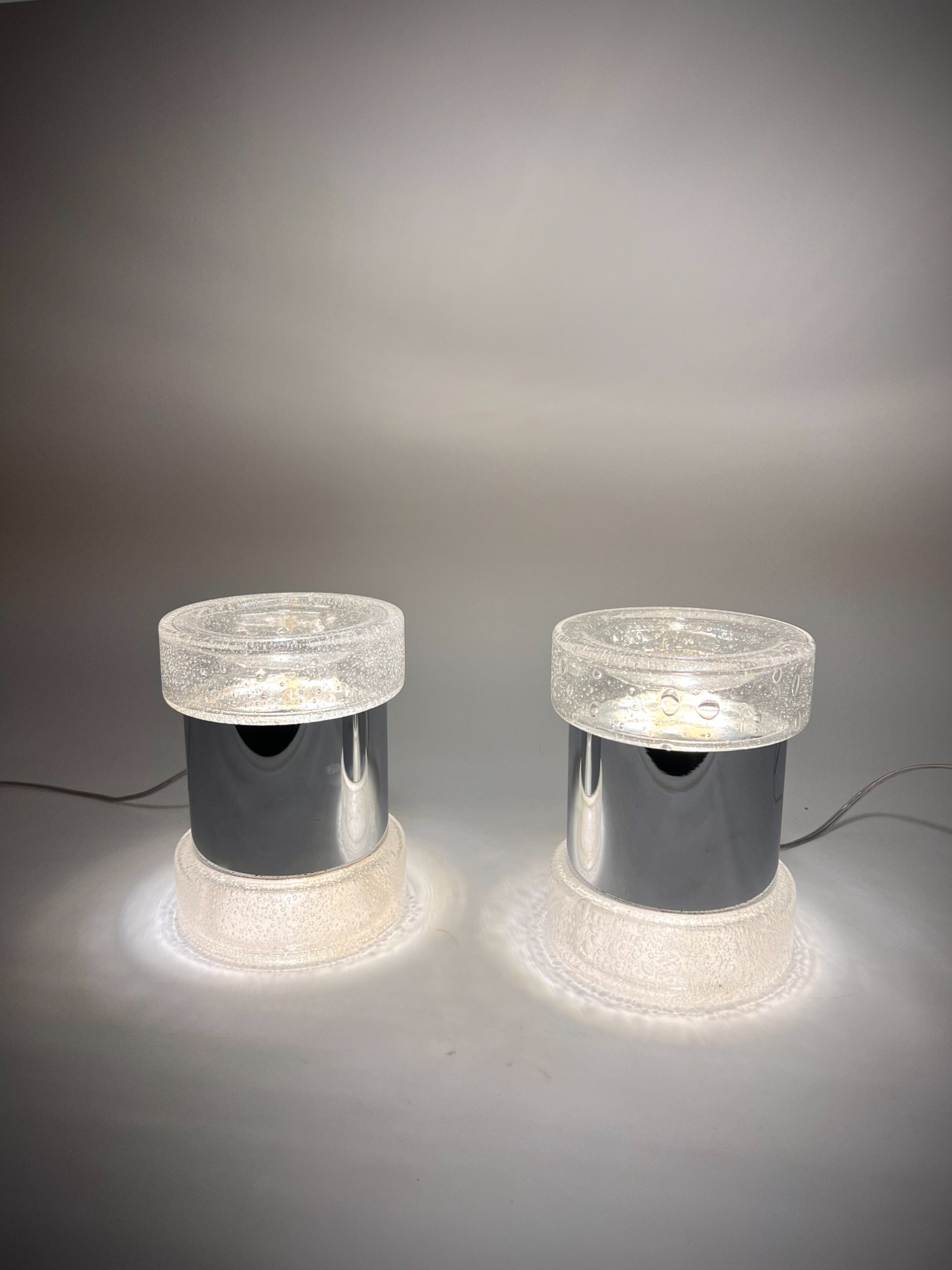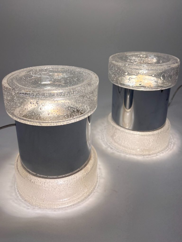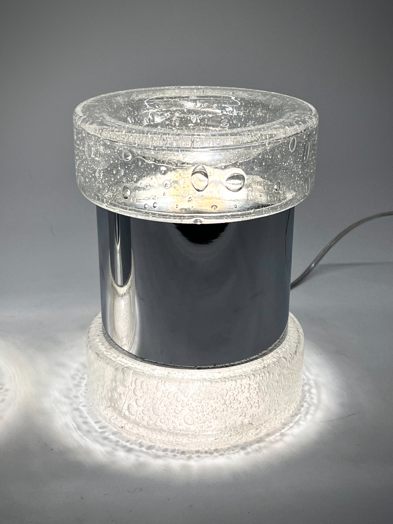 A beautifully balanced pair of Italian table lamps with polished chrome bases and thick bubble glass shades. The design is clean, modern, and quietly striking — the kind of piece that integrates effortlessly into interiors without demanding attention.