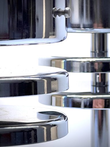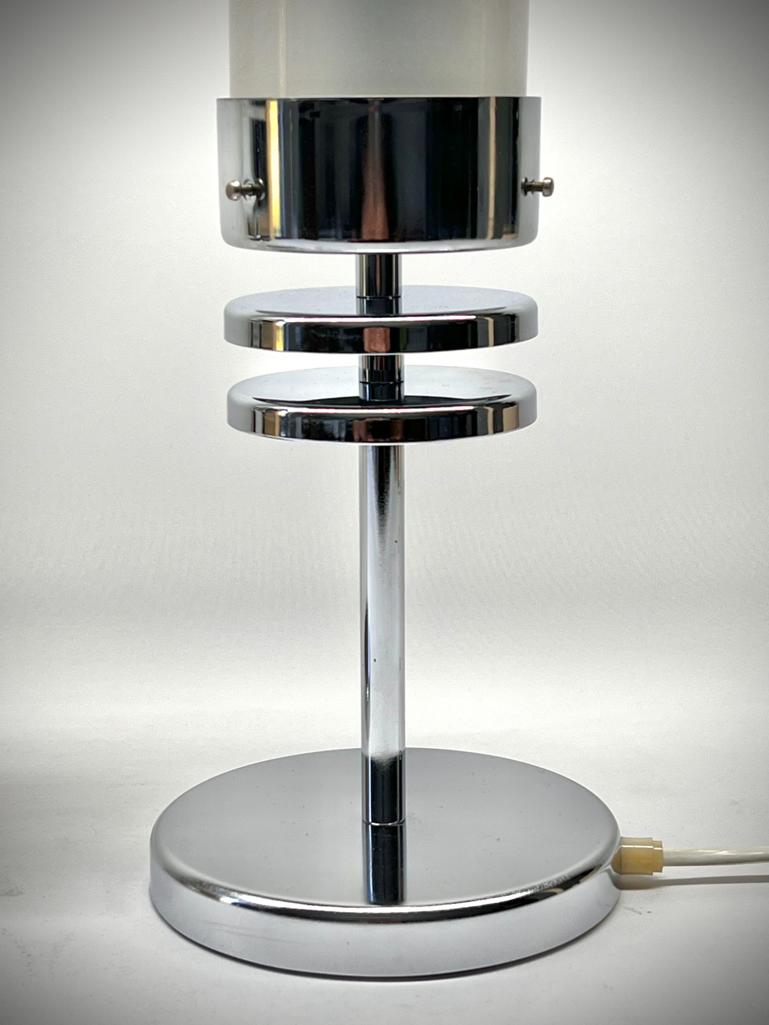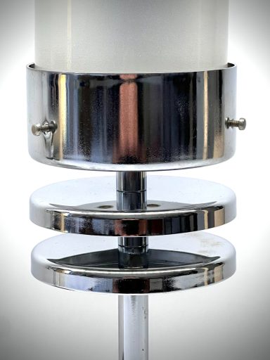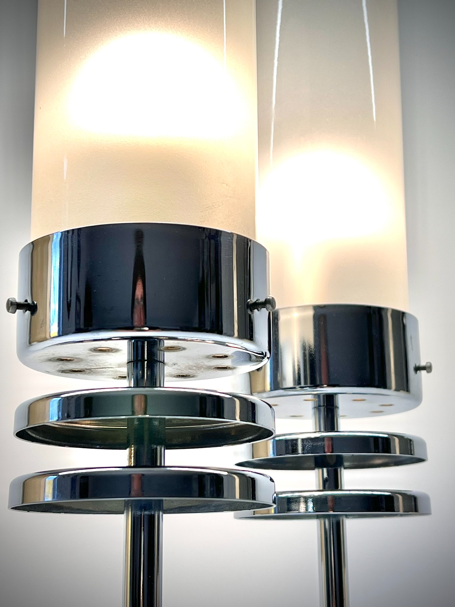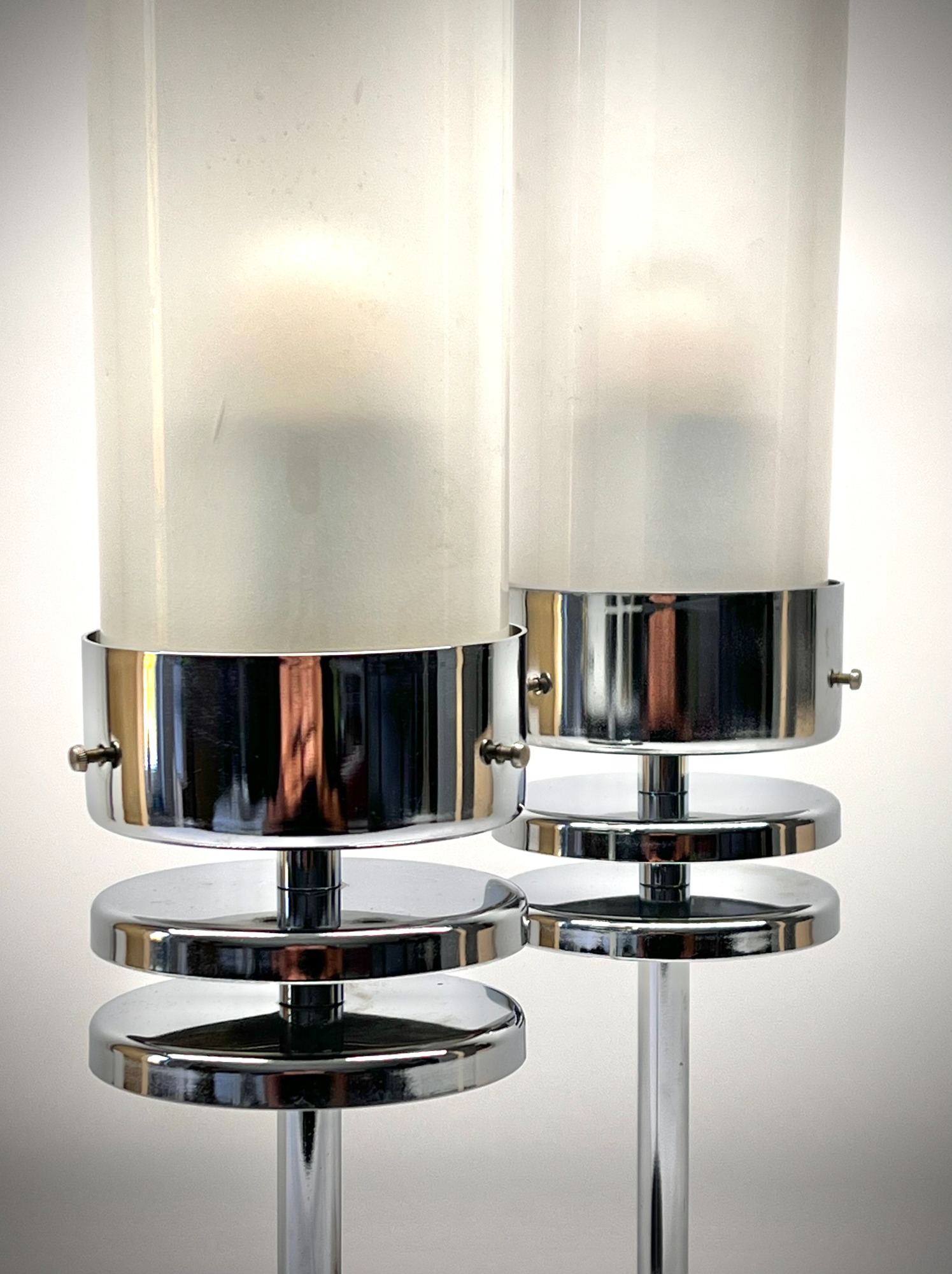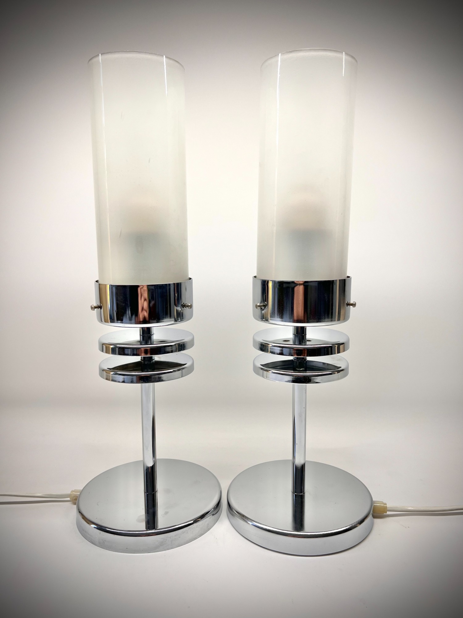 Pair of sculptural chrome table lamps featuring cylindrical frosted glass shades and tiered disc detailing — an elegant design bridging late Modernism and early Postmodernism.