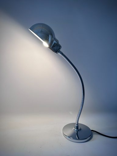 This chrome gooseneck lamp was originally designed for office or workshop use, but today it reads as a sculptural Space Age object. The dome shade, mirror‑polished surface, and integrated switch give it a futuristic clarity typical of Italian lighting from the 1970s. The construction is solid and purposeful — especially the heavy base — yet the overall look is sleek and minimal.