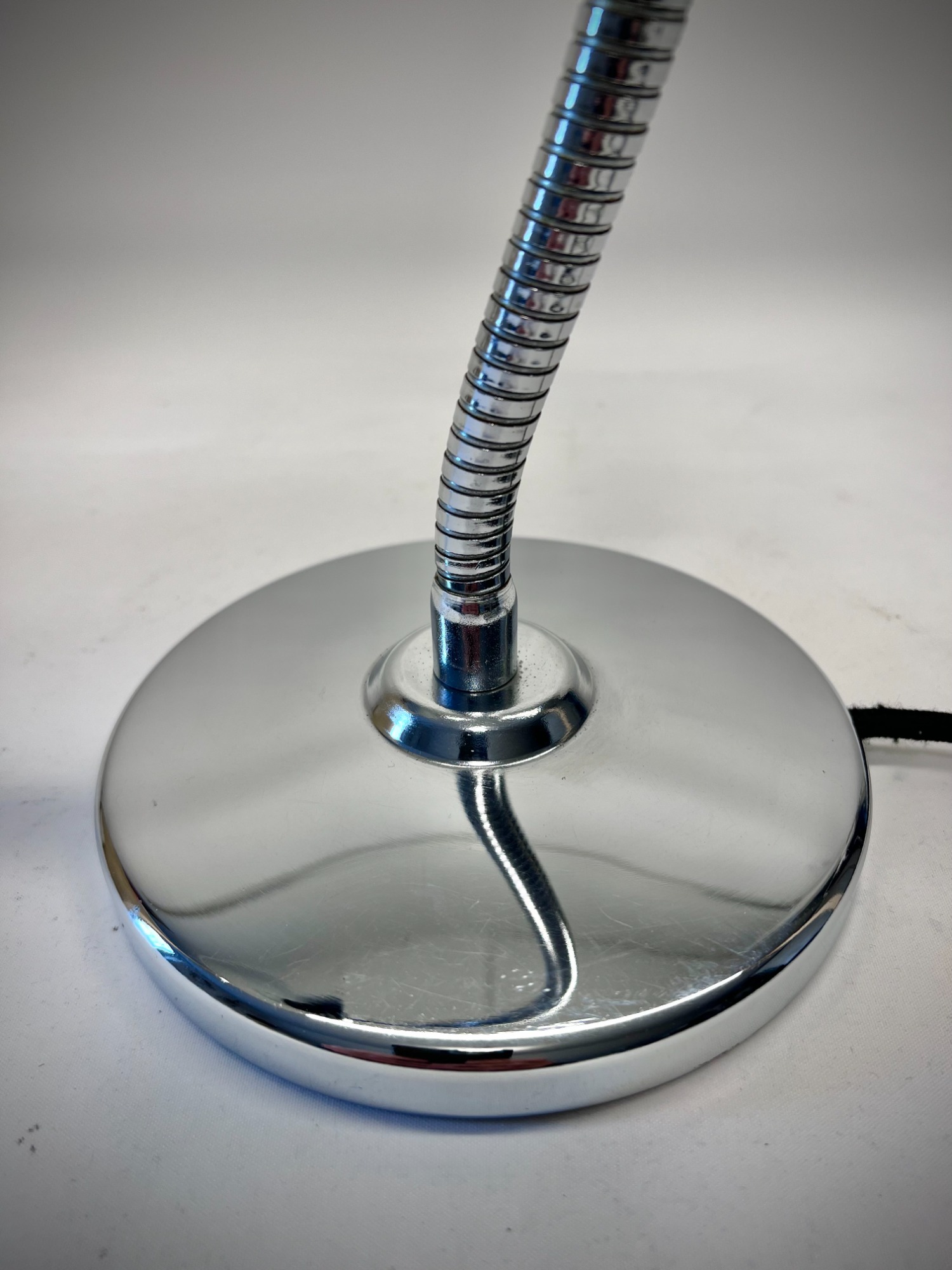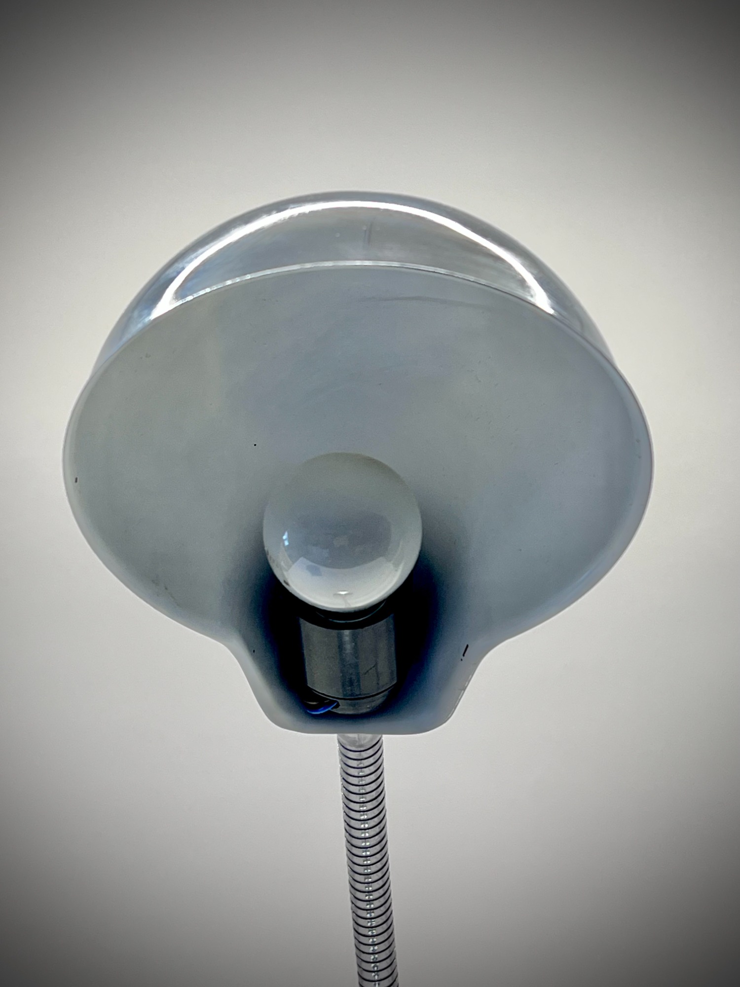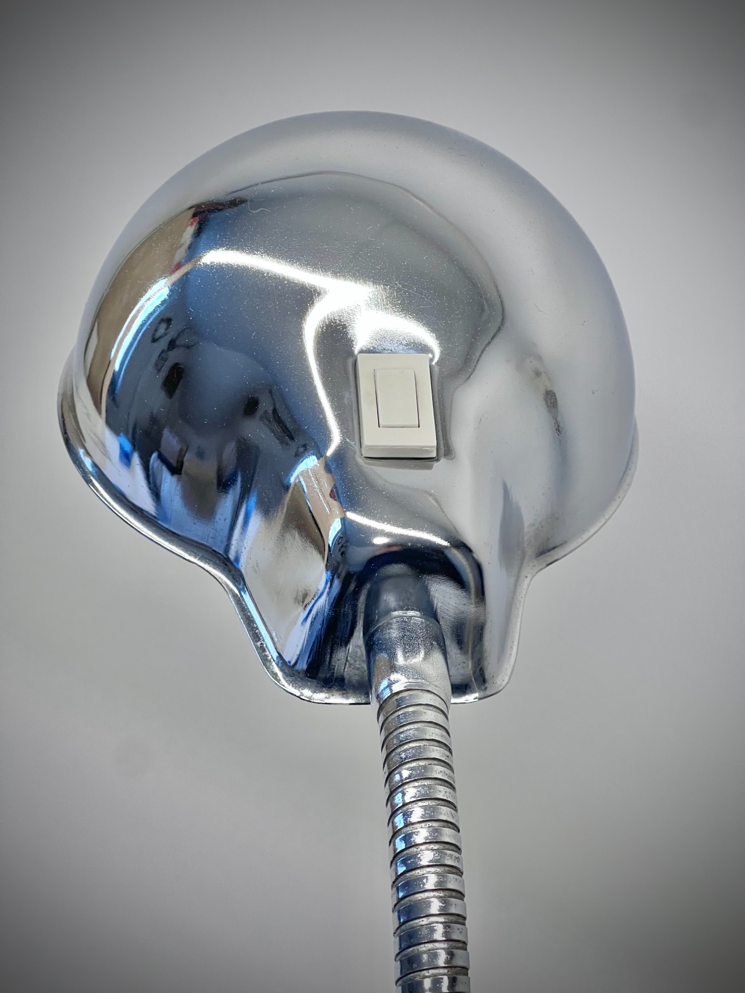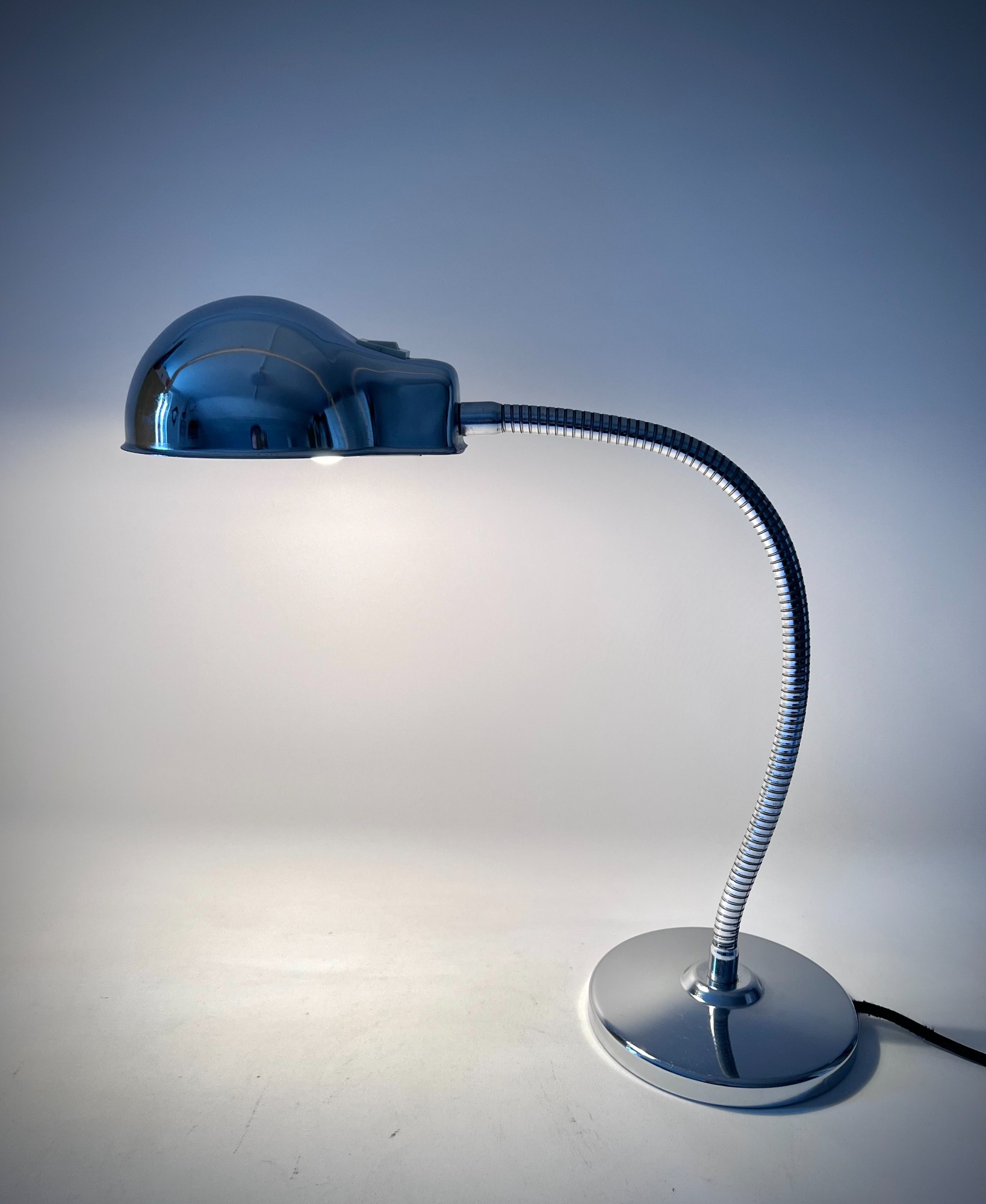 This chrome gooseneck lamp was originally designed for office or workshop use, but today it reads as a sculptural Space Age object. The dome shade, mirror‑polished surface, and integrated switch give it a futuristic clarity typical of Italian lighting from the 1970s. The construction is solid and purposeful — especially the heavy base — yet the overall look is sleek and minimal.