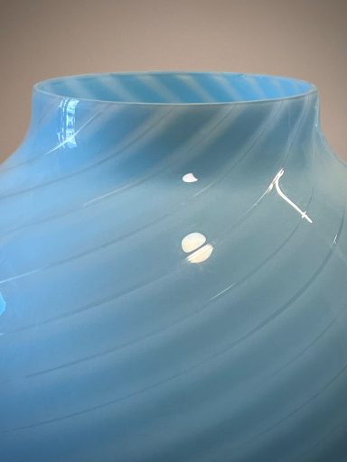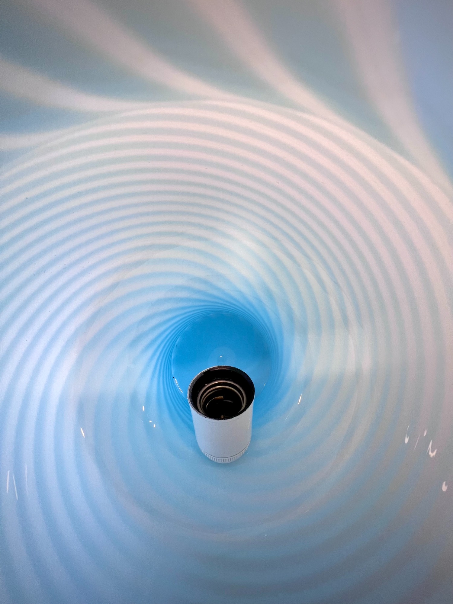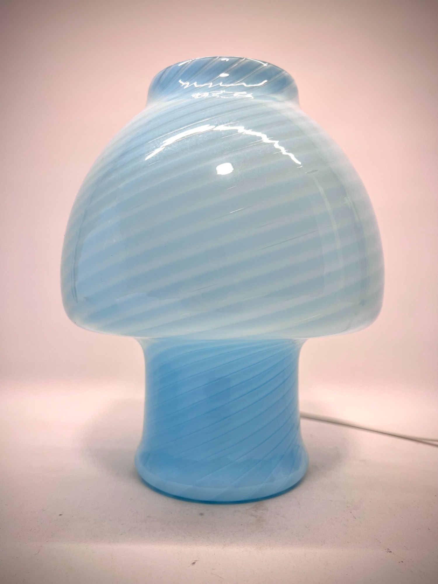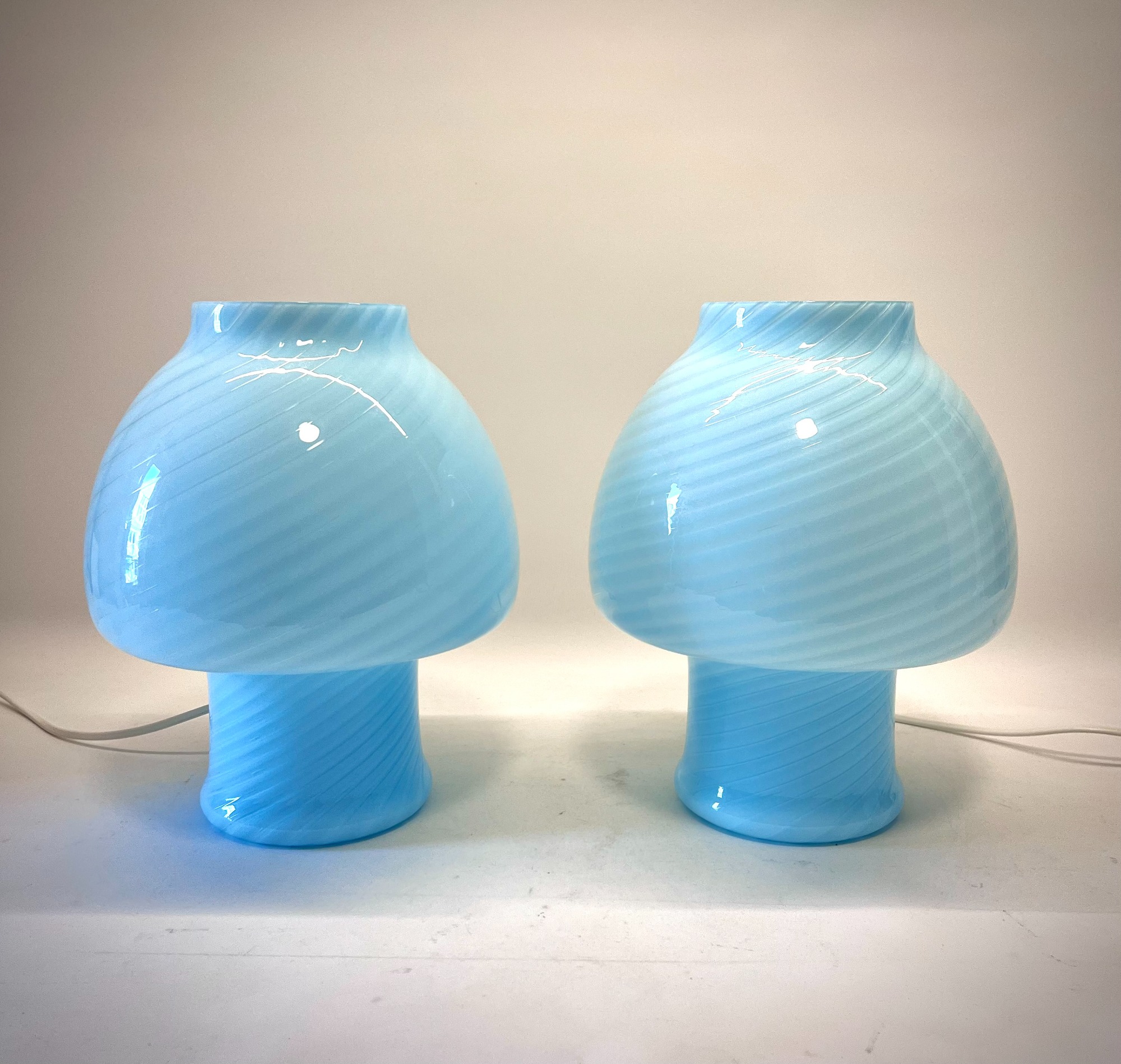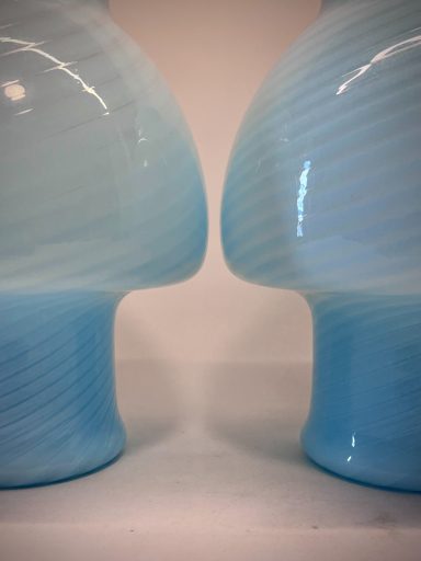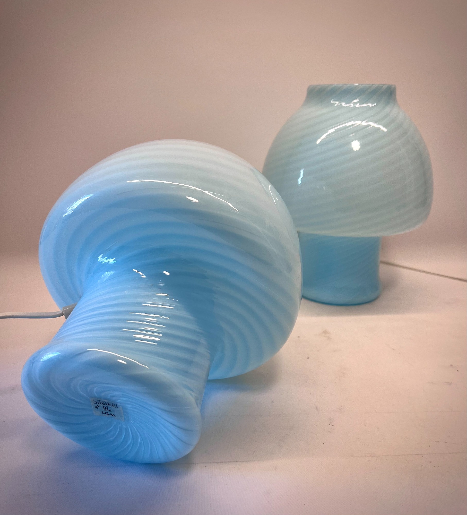 A matched pair of contemporary Murano glass mushroom lamps in a refined, luminous light‑blue tone with a diagonal swirl pattern. The colour is unusually soft and bright, giving the lamps a clearer and more distinctive presence than the common white versions. Each lamp is mouth‑blown in one piece, with shade and base formed from the same gather of glass. The swirl runs continuously across the silhouette, creating a calm, graphic rhythm.